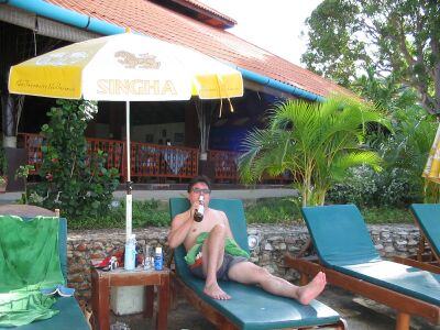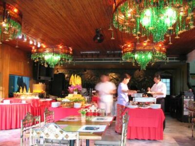 | デッキチェアの向こうはレストラン | 黒い豹の像があって、その向こうには精霊を奉ってあります |