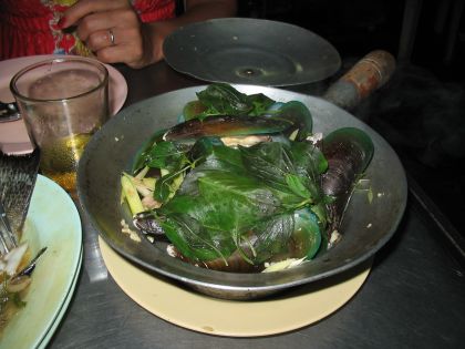 ・ムール貝にバジル、にんにく、みょうがみたいなのを載せて蒸したの