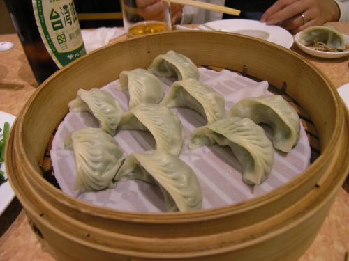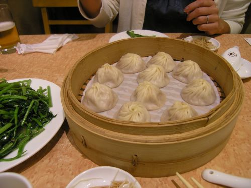 | 小籠包うまーい! 隣は空心菜 | 細長い店内 |